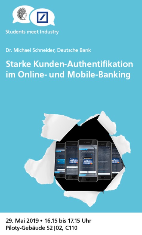 ![]()  ![]()  Students meet Industry: Starke Kunden-Authentifikation im Online- und Mobile-Banking (Deutsche Bank) 2019/05/29 29.05.2019, 16:15 – 17:15 Speaker: Dr. Michael Schneider, Deutsche Bank | Location: Hochschulstraße 10 (S2|02), Piloty building, Room C110, Darmstadt